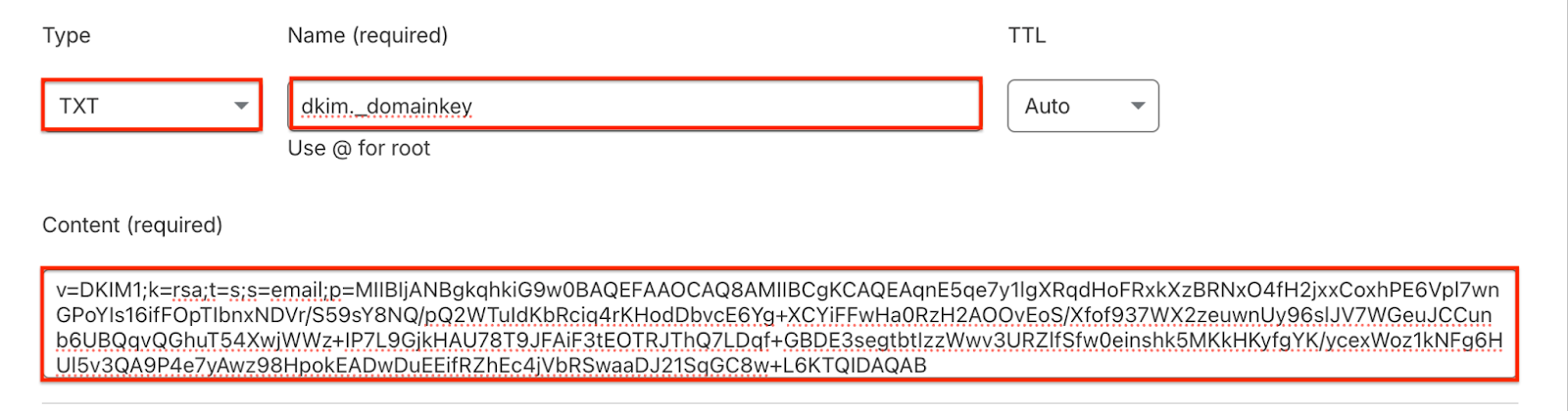 (This depends on your DNS provider. If the provider automatically appends your domain name, simply enter dkim._domainkey. Otherwise, enter the full host name dkim._domainkey.yourdomain.com.)