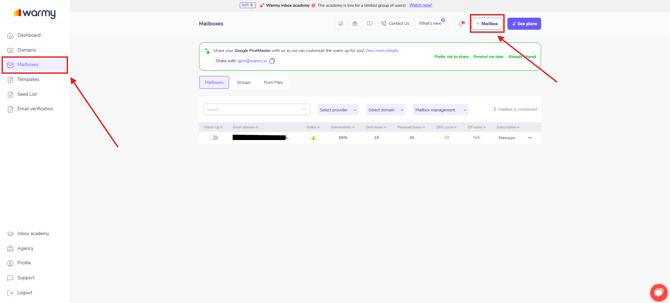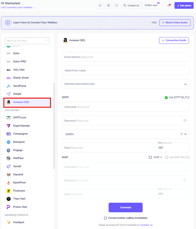 Step 3: Connect your Amazon SES mailbox to Warmy