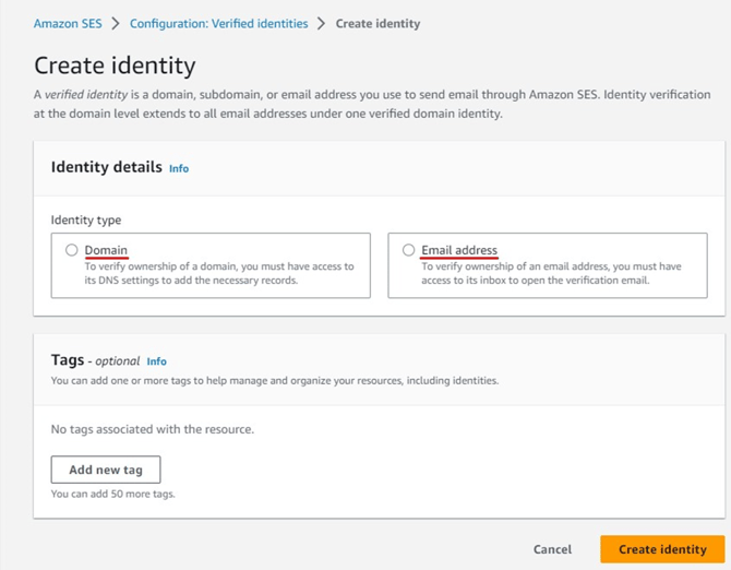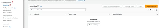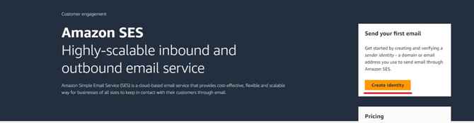 3 Click the Create Identity button and follow the on-screen instructions to create your Amazon SES object.