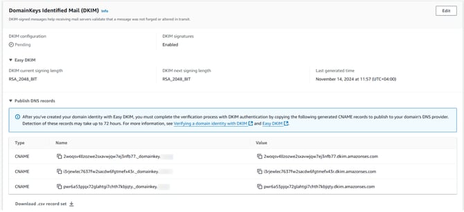 1. After clicking Create Identity, please head to Authentication on the Verified Identities page. Amazon SES will provide 3 CNAME Records for DKIM Settings. The next step is to implement these CNAME Records in our DNS Zone.