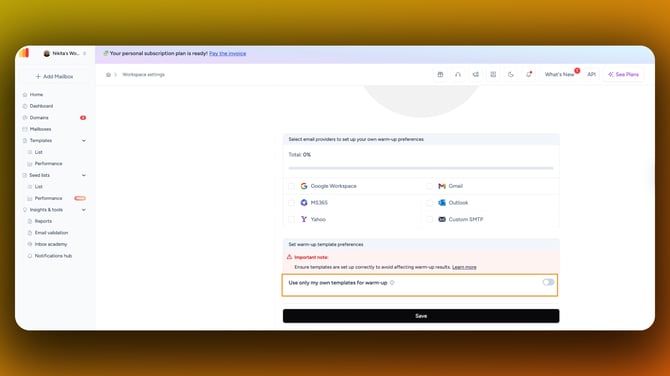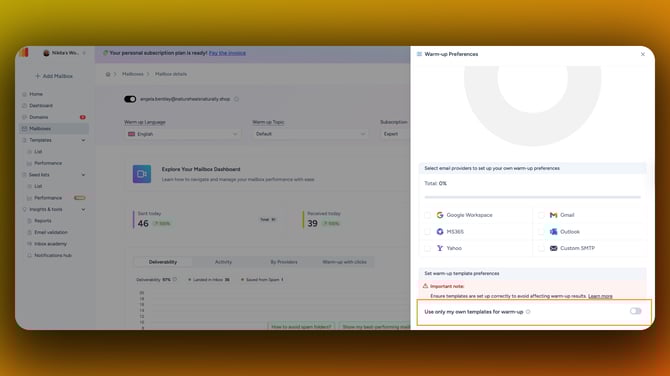 If you enable this feature, you must have active templates uploaded to your mailbox. > Warning: If "Use only own templates" is enabled but no templates are found in your library, your mailbox will stop sending warm-up emails. To ensure your warm-up stays active: