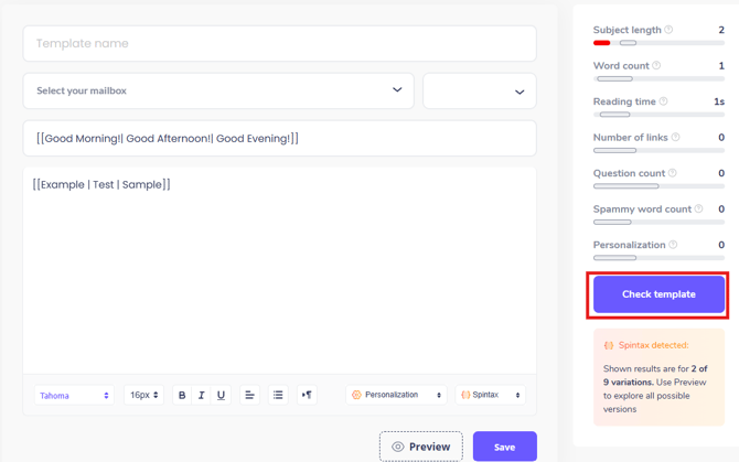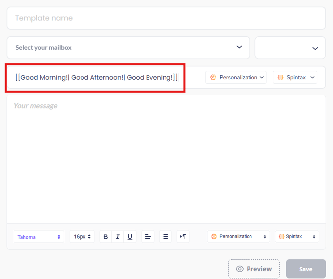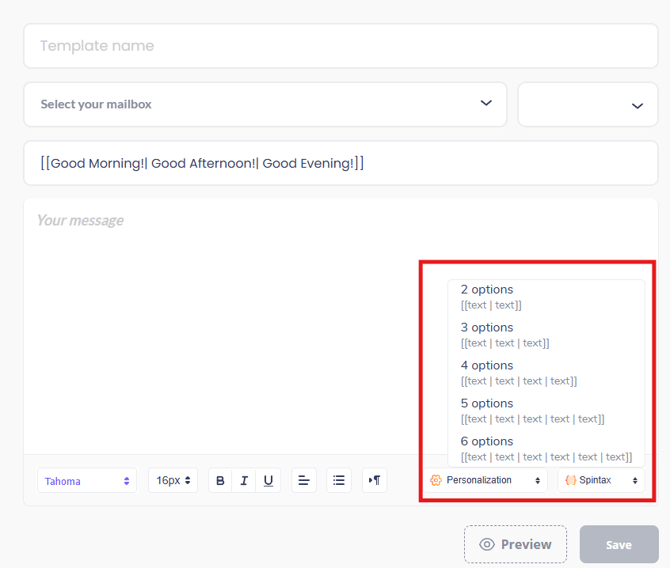 In the body of your email template, you’ll find the Spintax option as well. Just like in the subject line, you’ll have six Spintax choices to pick from.