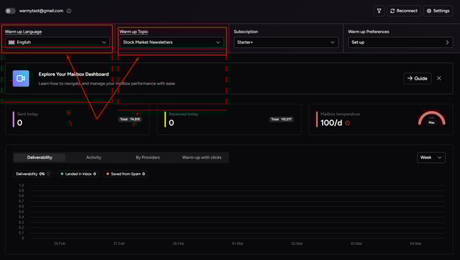 Most subscription plans allow you to choose the language and topic of warm-up emails.