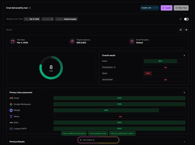 Warmy includes an Inbox Placement Test, which sends test emails to multiple providers to determine: