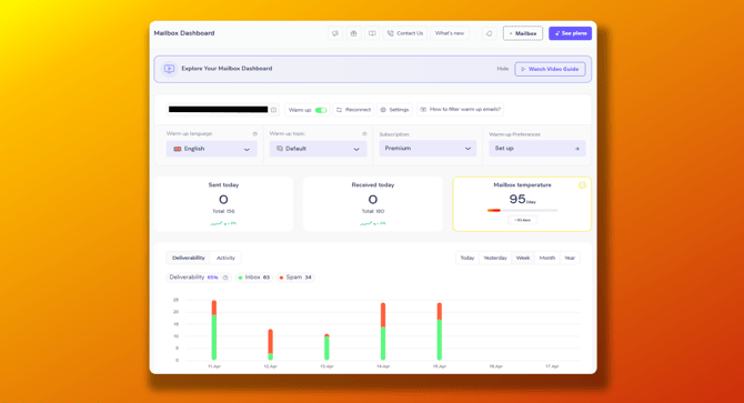 By going to the mailbox dashboard, you will be able to view your mailbox warm-up statistics. Here you can see a lot of useful information, such as sent and received emails, deliverability, current temperature, and related graphs ๐๐