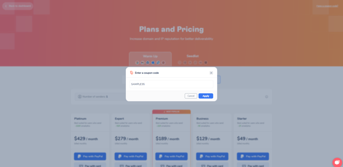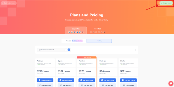 Where to apply the coupon/promo code To apply a coupon/promo code to your purchase, follow these steps: Go to the "See plans" Find a "Have a coupon code?" section. Use your coupon. Enter your coupon code in the field provided and then click apply. The discount will be applied to your total purchase amount. 4. Now you can see that it was applied and prices have changed Need help? Schedule a call with us 👨🏻💻